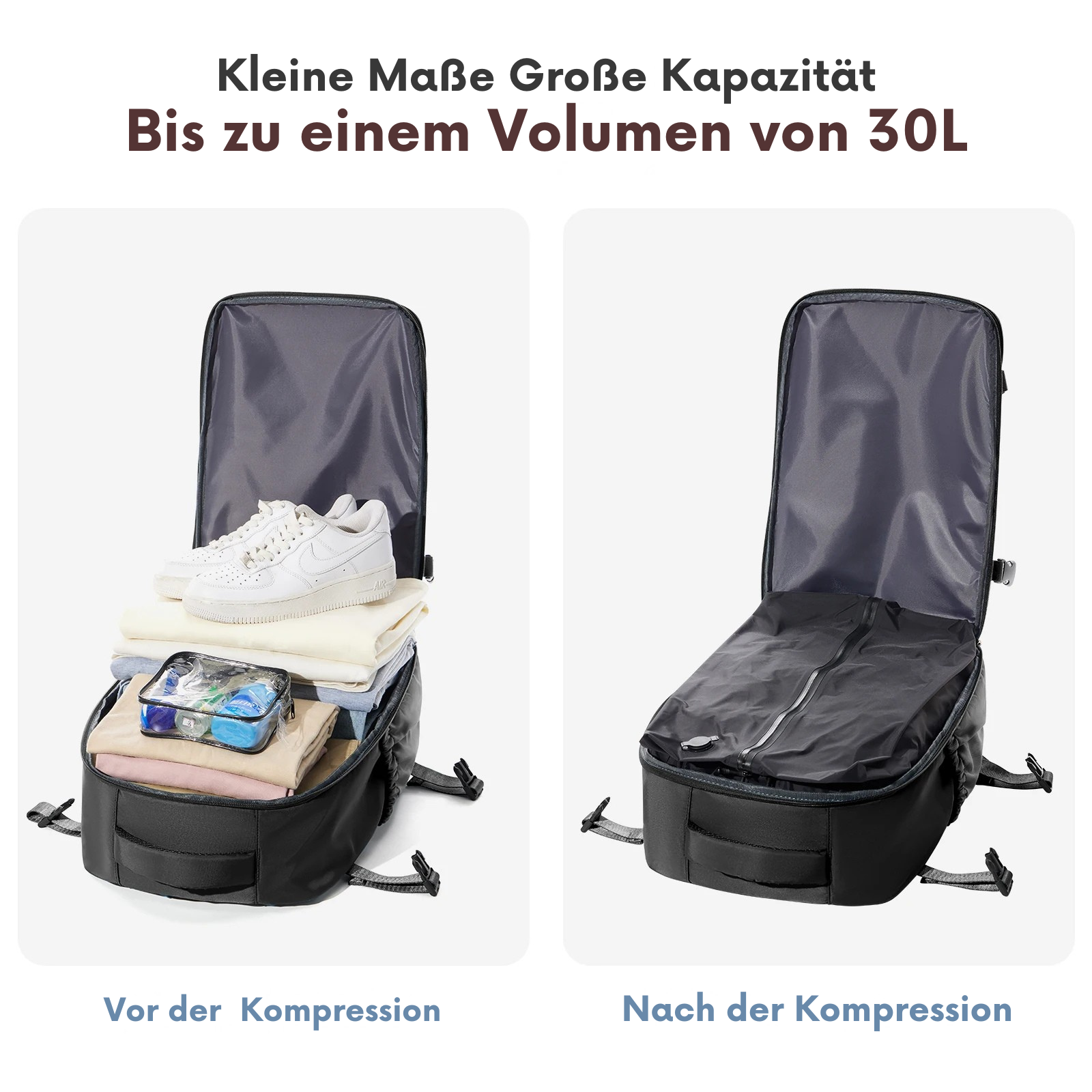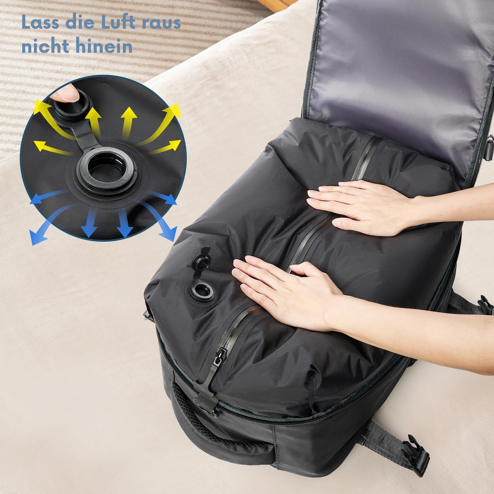 Mehr Platz. Weniger Stress. Deine Reise neu gedacht. Die erste Reisetasche mit integrierter Vakuum-Funktion – endlich Schluss mit Übergepäck und Chaos.